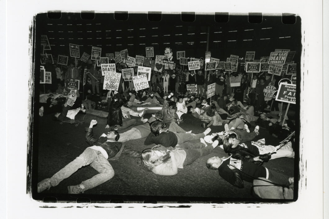 Jordan Peimer joined ACT UP in March of 1988 and was a member until the Spring of 1993. He participated in numerous actions including two overnight vigils at County USC Hospital, protests at Frontera Prison, Federal Buildings in Westwood and Downtown Los Angeles and visits to many homophobic and AIDSphobic politician’s homes including those of Supervisor Pete Schabarum and Governor Deukmejian. While in ACT UP he helped develop protest graphics and other ephemera in conjunction with the artists collective Critical Mass which he formed with the late Joshua Patrick Wells. He also helped form the performance collectives ATTACK (Artists Take The Action In Cultural Krisis) which created the “Art Criminal Chain Gang” to protest the attacks on the “NEA Four”. He was also a member of R.E.D. (Radical Exterior Decorators) an arts protest collective. He was arrested six or seven times for civil disobedience. Peimer helped develop a number of successful and controversial fundraising events for ACT UP and Highways Performance Space (where he would eventually become Co-Artistic Director). These fundraisers included Naked City, Trouble and Highways is Burning. Each one of these events raised more than $10,000 for each organization.