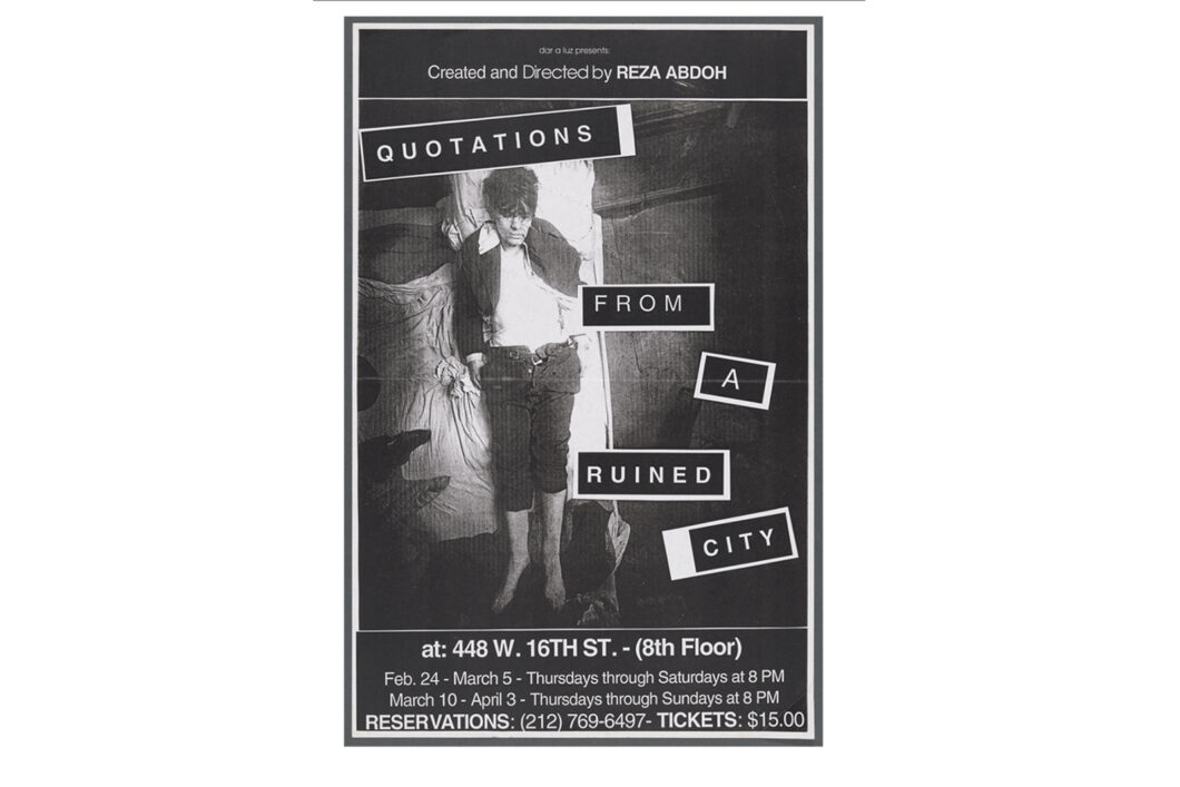 Quotations From a Ruined City was first performed as a workshop production for the Los Angeles Festival in a former shoe store on Hollywood Blvd. The production subsequently moved to a vacant pajama factory in New York’s meatpacking district and went on to be presented by multiple European presenters. It was Abdoh’s final work.